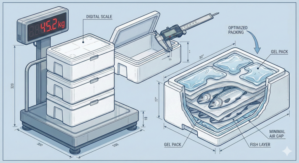 航空運賃は、実重量と容積重量の大きい方が適用されます。理想は「箱いっぱいに商品が詰まっており、隙間が最小限」の状態です。あさひ通商では、45kgの貨物を構成する際、箱のサイズ選定から保冷剤の配置までミリ単位でアドバイスします。保冷剤を入れすぎれば送料が高くなり、少なすぎれば鮮度が落ちます。この「鮮度と送料の妥協点」を見極めるのが、私たちのプロフェッショナルな領域です。まずはここだけ押さえれば十分です。45kgという数字は、単なるルールではなく「利益を守るための盾」なのです。