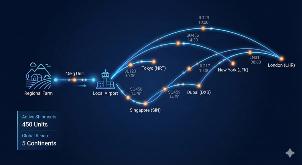 2026年現在、世界的な日本食ブームは第3フェーズに入っています。単なる「日本産」というラベルだけでは差別化できず、「いつ、誰が、どう処理し、どう運んだか」という鮮度の透明性が問われる時代です。ここで勝負を分けるのが航空便ですが、小規模事業者が陥りやすいのが「送料による利益の圧迫」です。その解決策が「45kg」という数字に隠されています。